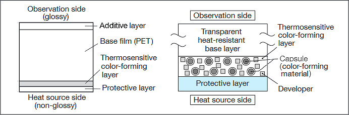 Thermoscale films are available only in a single-sheet format (mono sheet type). This single-sheet type consists of a single PET sheet with an extremely homogeneous layer of microcapsules (proprietary PSC - Particle Size Control technology), which contain a substance that changes color depending on the development material of the dye. As the temperature increases, the dye penetrates the microcapsule membranes.