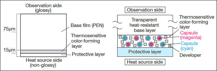Thermoscale films are available only in single-sheet format (mono sheet type). This single-sheet type consists of a sensitive PEN film, on which an extremely uniform layer of microcapsules is deposited (using proprietary PSC - Particle Size Control technology). These microcapsules contain a substance capable of changing color based on the color developer material, which, as the temperature increases, penetrates the membranes of the microcapsules.